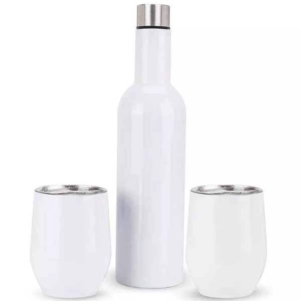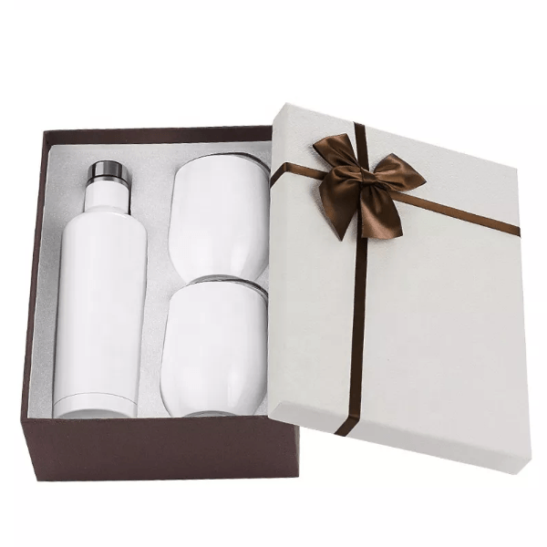 # Comes with gift box: Two 12 oz stemless wine glasses and one 17 oz wine bottle.